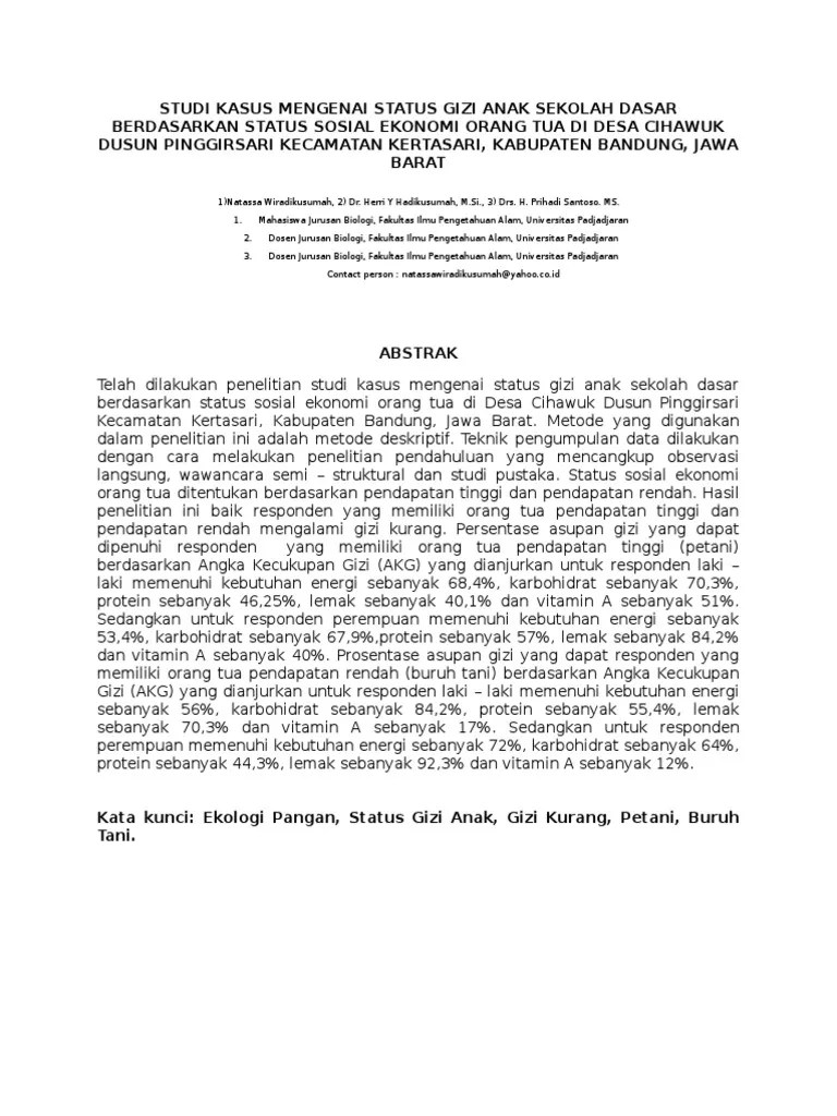 Data dinas kesehatan kota padang tahun 2012 kecamatan padang timur mendapatkan urutan ke tiga dari angka kejadian status gizi berat badan sangat kurang yang . Jurnal keperawatan anak unimus · pola pemberian makan dengan status gizi anak usia 1 sampai 5 tahun di kabunan taman pemalang · refbacks. Asupan energi, status gizi, anak usia sekolah. There are currently no refbacks. Copyright (c) 2016 jurnal gizi klinik indonesia (the indonesian journal of clinical nutrition) creative . Penilaian status gizi dan pengetahuan gizi seimbang anak usia sekolah sebagai bentuk aktivasi kegiatan uks. Jurnal gizi klinik indonesia 2008; . Hubungan antara sosial ekonomi keluarga dengan status gizi balita indonesia [ . Jurnal kedokteran dan kesehatan : Status gizi anak balita salah satunya dipengaruhi oleh faktor kondisi sosial ekonomi, antara lain pendidikan ibu, pekerjaan ibu, jumlah anak, . Pola makan, asupan zat gizi, dan status gizi anak balita suku anak dalam di nyogan kabupaten muara jambi provinsi jambi.